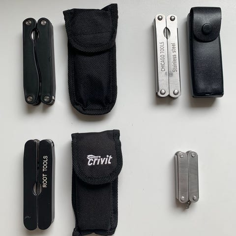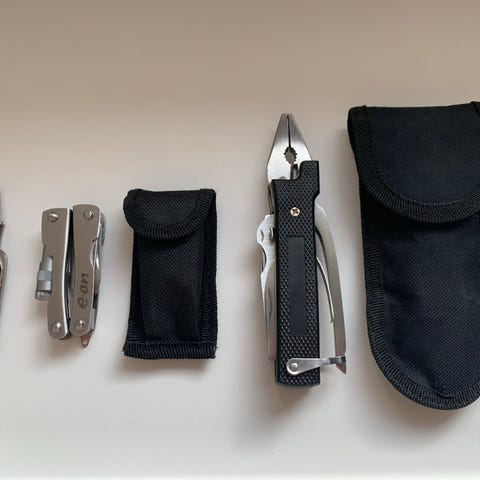 4 forskellige multitool (3 stk. med sort bæreetui). Værktøjet har blandt andet tang, knivblade, sav og forskellige små værktøjsfunktioner, som kan foldes ud efter behov. Leveres med etui (3 stk.), der kan fastgøres i bæltet. Velegnet som kompakt værktøj til hverdag og fritid, fx i lommen, bilen eller rygsækken.