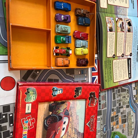 Der er bl.a. fjernstyret truck,biler med funktioner, puslespils bog ,legetæppe bog med biler, kuffert vaskehal og en masse cars