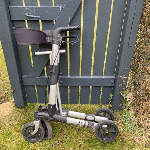 Sammenklappelig rollator med fire hjul, kurv/net og fast sæde. Rollatoren har håndbremser på begge håndtag og kan foldes sammen for nem opbevaring og transport. Egnet til indendørs og udendørs brug afhængigt af underlag. Justerbare håndtag kan tilpasses brugerens højde. Farve i grå og sort. rollator fungerer som den skal 350 kr. fast pris
