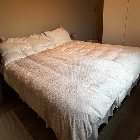 Topmadrassen er købt i januar 2026 og kun brugt ca. 4-5 gange, så den fremstår næsten som ny.