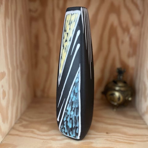 Flot vintage vase fra Søholm Keramik, Bornholm. Vasen har en smuk sort glasur med dekorativt mønster i turkis, gul og lys glasur – typisk for Søholms keramiske design.