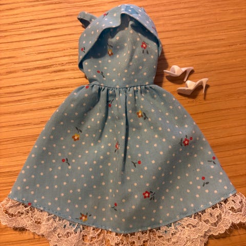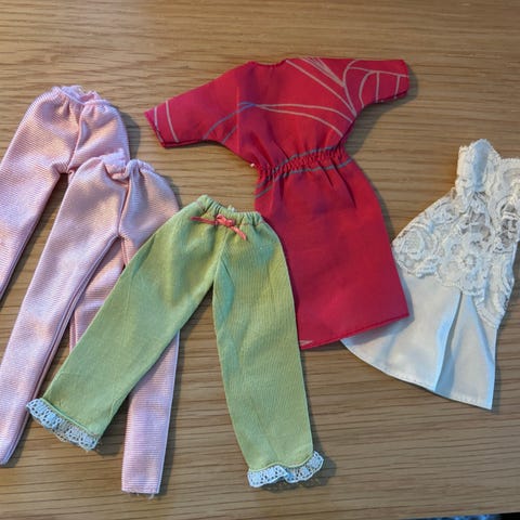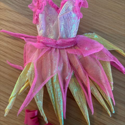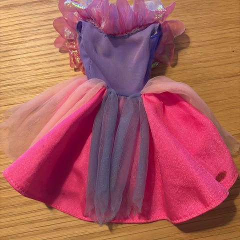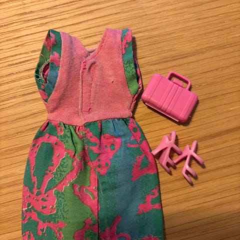 Barbie dukketøj bestående af lyserød kjole, trusser og matchende sko. Kjolen er uden ærmer med stropper og har lag i tyl/net samt lyse detaljer foran. Sættet er beregnet til Barbie-dukker. Outfit #1113