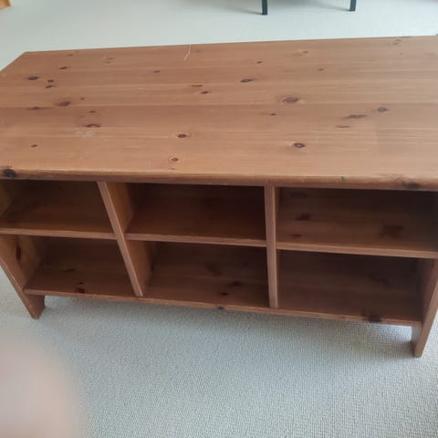 sofabord med opbevaring i massivt træ. Bordet har låg med kraftige metalhængsler og beslag samt håndtag i siderne, hvilket giver nem adgang til opbevaringsrummet indeni. Velegnet som sofabord eller lavt sidebord med ekstra opbevaringsplads til f.eks. tæpper, puder eller andre ting i stuen. Overfladen fremstår med synlig træstruktur og naturligt udtryk, og bordet står på et lavt sokkelunderlag, der passer til de fleste gulvtyper.