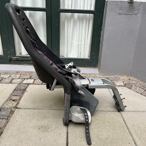 Maxi-Cosi cykelstol til montering bag på cyklen. Cykelstolen er beregnet til børn op til ca. 22 kg. Modellen har integreret ryglæn, ventilationshuller i ryggen og justerbare skulderstropper med 3-punktssele. Der er fodstøtter med justerbare remme til barnets fødder. Sædet er i hård plast i en mørk, neutral farve og er velegnet til daglig transport af børn på cykel.