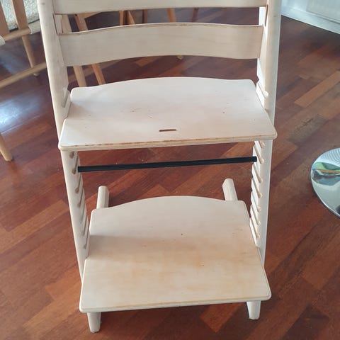 Stokke højstol i træ med naturfarvet finish af ældre model. Brugt til 1 barn. Er i fin stand men har lidt brugsspor og trænger til en aftørring 😊