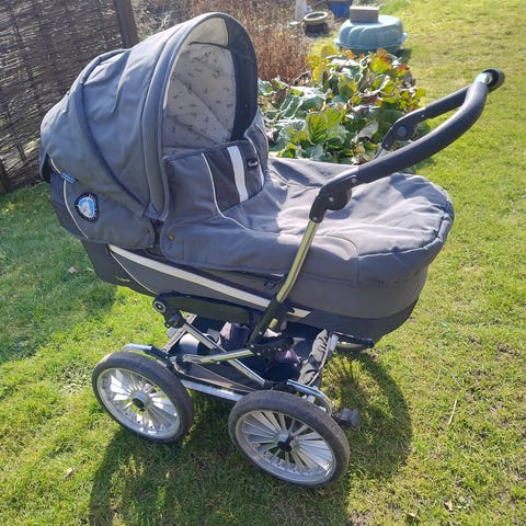 Pæn og velholdt Emmaljunga barnevogn med indstilleligt håndtag, bremse på både for-og baghjul, tempereringsmulighed i bund og kaleche, madras, barnevognssele, regnslag, insektet samt Emaljunga babylift med Dunkopillo madras.