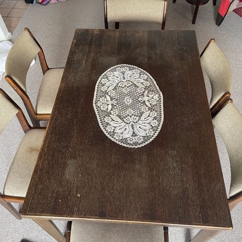 Et Gangsø spisebordssæt med stole til seks personer. Bordet kommer med forlængelse, der nemt kan sættes på og tages af efter behov. Sættet er af ældre dato, men er i god stand i forhold til alderen, og er derfor ideelt til hvis man skal til at flytte hjemmefra og har brug for et billigt spisebordssæt til at starte med.