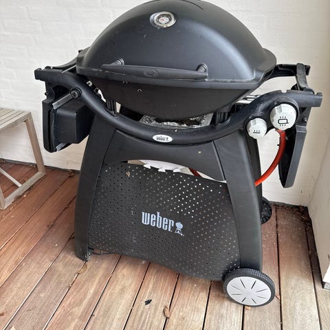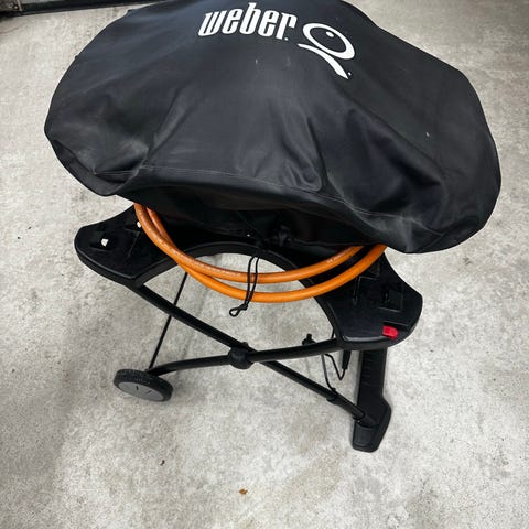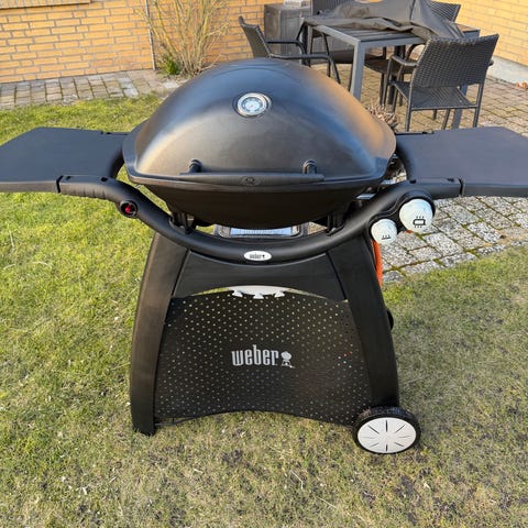 Weber Q gasgrill i sort med låg og sideborde. Grillen står på vogn med to hjul, så den er nem at flytte rundt på terrassen. Der medfølger rotisseri med motor samt grillrist. Grillen tilsluttes gasflaske via gasslange, som ses på billederne. Velegnet til udendørs madlavning og grillning af kød, fjerkræ og grøntsager.
