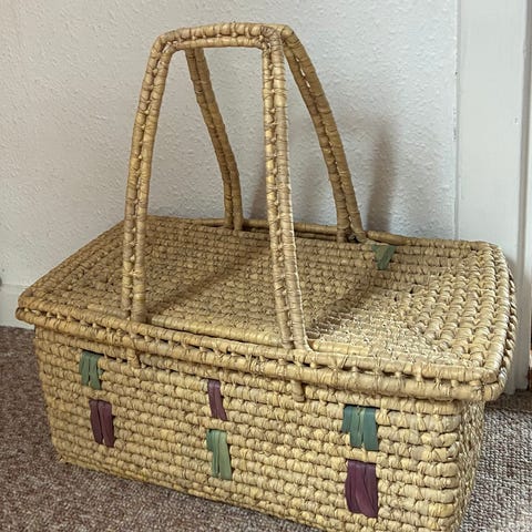 Kurv i flettet naturmateriale. Kurven har fast hank og todelt låg, som kan åbnes fra begge sider. Velegnet til opbevaring i hjemmet generelt, f.eks. til tekstiler, legetøj eller picnicudstyr. Neutral naturfarve, der passer ind i mange indretninger.