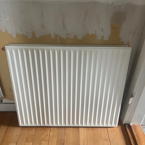 2 stk. Hvide radiatorer i metal med 3 lameller. Tilslutningsrør, termostater og overskydende rør medfølger. Måler 120 x 45 x 16 og 180 x 55 x 16 (l x b x d)