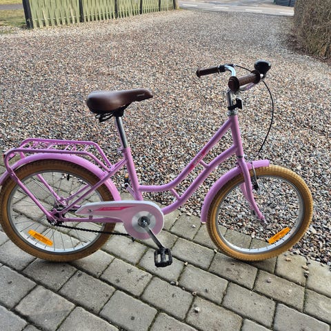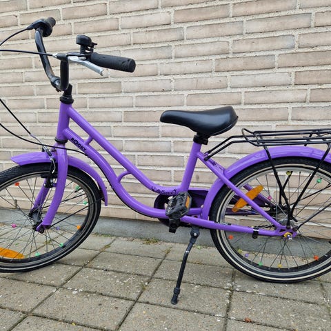 Børnecykel med 20" hjul i lilla farve. Cyklen har lav indstigning, kædeskærm, bagagebærer og kurv foran. Udstyret med håndbremser og støtteben. Velegnet til børn, der passer til en cykel med 20" hjulstørrelse. Cykelhjelm følger med.