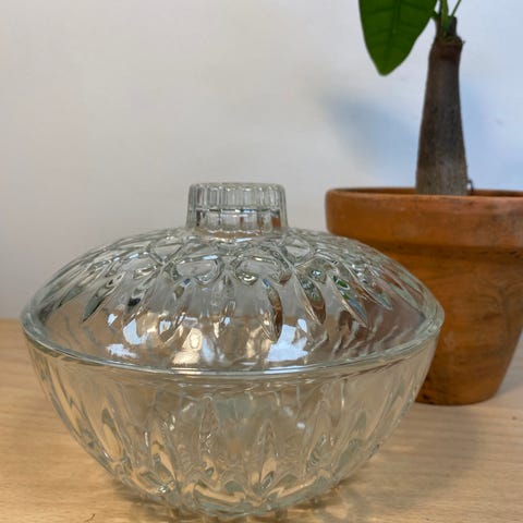 Multifunktionel glaskrukke, glasskål, smykkeskrin, vatrondel. Udstillet sammen m. Liva Weel krukke (SOLGT)
