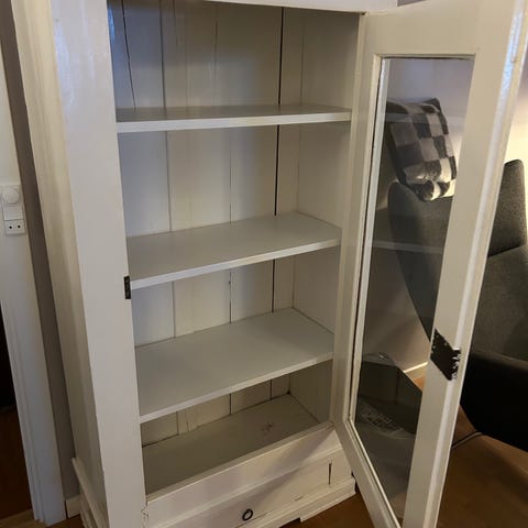 Væghængt Københavner-skab med glas-skydelåger og 6 skuffer.