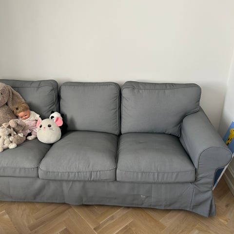 205 × 94 × 85 cm (B × D × H). Stoffet er Blekinge hvid, som kan tages af og vaskes.