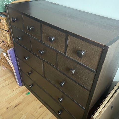 Kommode i brun massiv træ med udskæringer og drejede ben