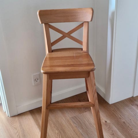 IKEA juniorstol Ingolf i hvidmalet træ. Stolen har ryg med krydsdetalje og fodstøtte. Egnet som siddeplads til børn ved bord eller køkkenø, hvor der er behov for en højere stol. Klassisk design, der passer ind i de fleste indretninger.