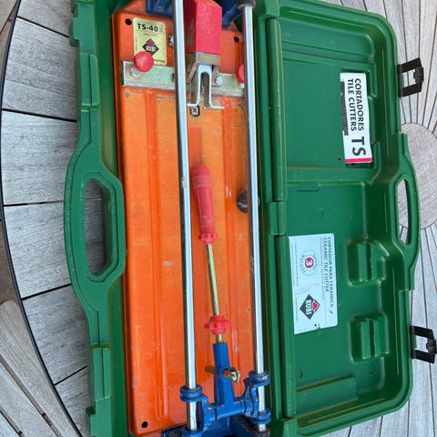 Elektrisk fliseskærer fra ukendt mærke. Maskinen har integreret skærebord og styreskinne til føring af fliser eller andre emner under skæringen. Udstyret med elkabel og stik til tilslutning i almindelig stikkontakt. Egnet til skæring af fliser ved renovering af bolig.