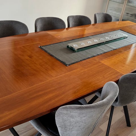 Der er overfladiske ridser på hele fladen efter daglig brug. Bordpladen alene kunne derfor godt bruge en opfrisker, se fotos.