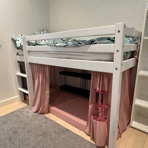 Halvhøj seng, fungerer fint. Er skilt ad.