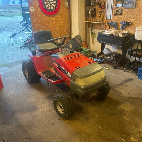 Rød havetraktor plænetraktor med førersæde og ratstyring. Modellen har fire hjul og sideudkast til græs. Egnet til klipning af større græsarealer og plæner. Maskinen er udstyret med klippebord under traktoren og er beregnet til kørsel på græs og jævnt terræn. Trænger til justering af rem eller måske en ny rem.