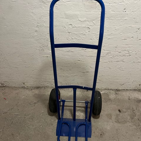 Sækkevogn i ukendt mærke med gråt metalstel og plastgreb i lys farve. Vognen har to hjul og en bundplade til placering af kasser, poser eller andre genstande. Egnet til transport af mindre læs i hjem, kælder, garage eller lignende. Stellet er slankt og kan efter alt at dømme stilles op ad væg eller i et hjørne, så det fylder minimalt, når det ikke er i brug.