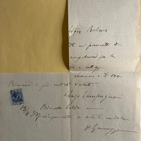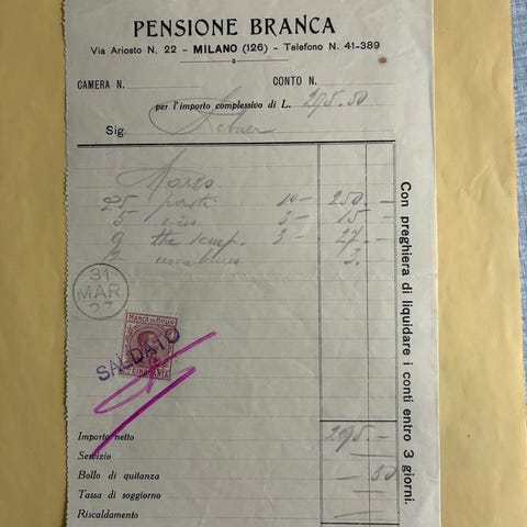 Det er fyldt med elegant italiensk håndskrift, gamle lire‑beløb og to flotte frimærker, der skriger “antik charme” og “jeg har overlevet mere end de fleste”.