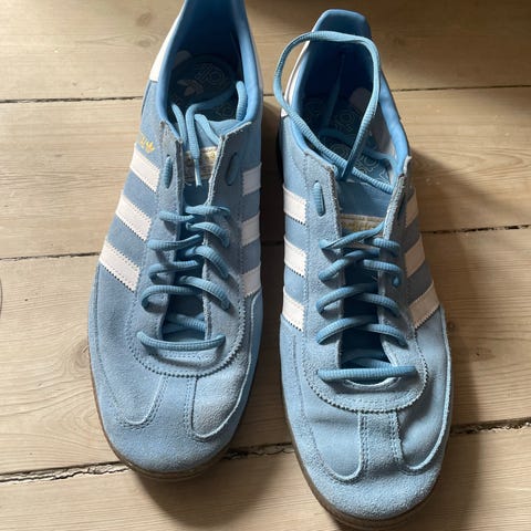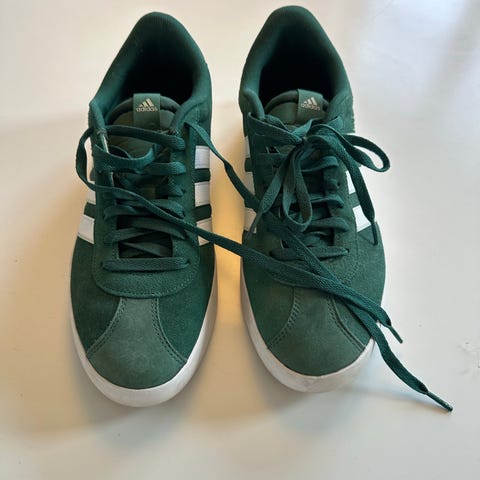 Adidas sneakers i størrelse 49. Skoene er turkis med hvide snørebånd og hvid sål. Overdelen er i tekstil med klassiske Adidas-striber i siden. Ydersålen har mønstret gummibelægning for greb. Velegnet som hverdagssko eller fritidssko.