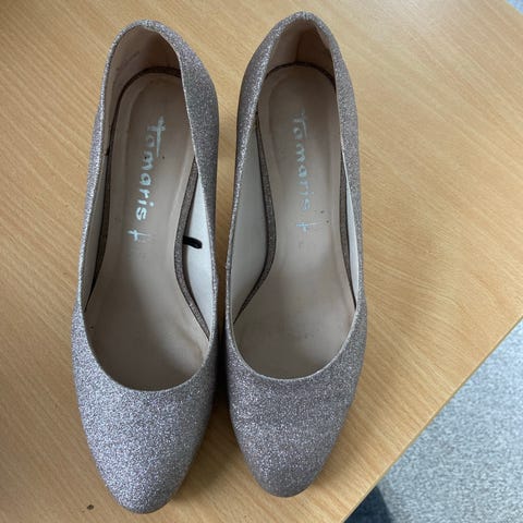 Mellem-høj hæl, der egner sig til brug ved festlige lejligheder og andre anledninger, hvor der ønskes en klassisk og enkel pumps-lignende sko. Materiale fremstår som glat overflade, og sålen er udformet til almindelig hverdags- og festbrug.