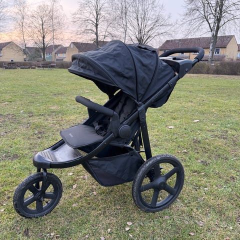 Plads til to børn, seler, myggenet og god plads til opbevaring bag sæderne.