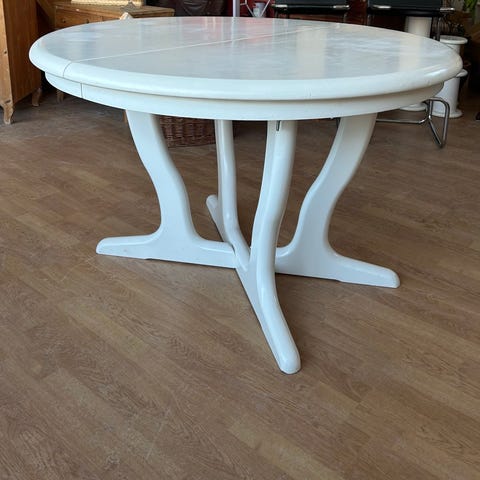 Rundt bord med hvid overflade der er let at gøre ren. Det er 120 cm i diameter og 75 cm højt. Benene og underbordet er af massiv træ (eg). Vi kender ikke mærket af bordet, men det er solidt og af god kvalitet.