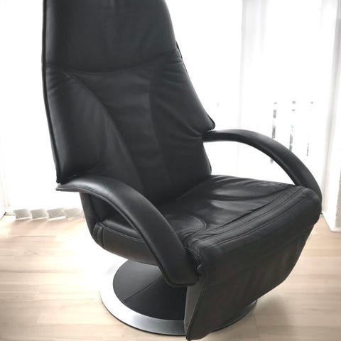 ET stk. Berg Furniture cognac farvet læderlænestole med rigtig god siddekomfort kan dreje og vippe tilbage. ligeledes kan fodskammel justeres efter behov. Den er i rigtig god stand sælges for kun 2.500 kr. da den har stået i skånsomt rygerhjem. Nypris for tilsvarene model er ca. 25.000 kr. Tlf. 40742594.