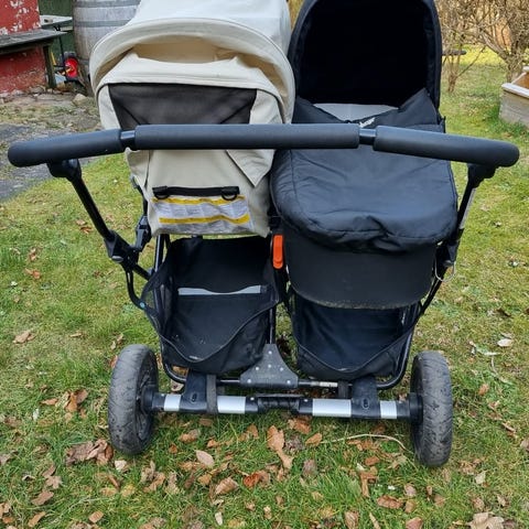 Mountain Buggy tvillingeklapvogn i dobbeltudgave med to side‑om‑side sæder.