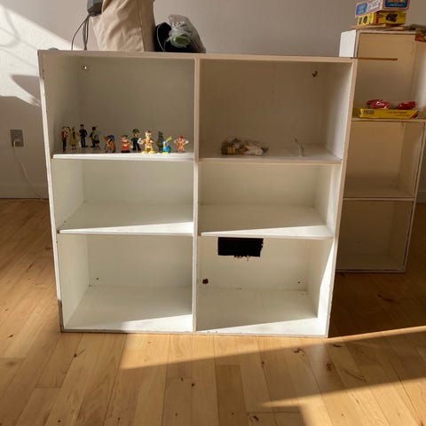 Fin hvid bogkasse med mulighed for en skuffe i midten, der kan være enten sort eller rød.