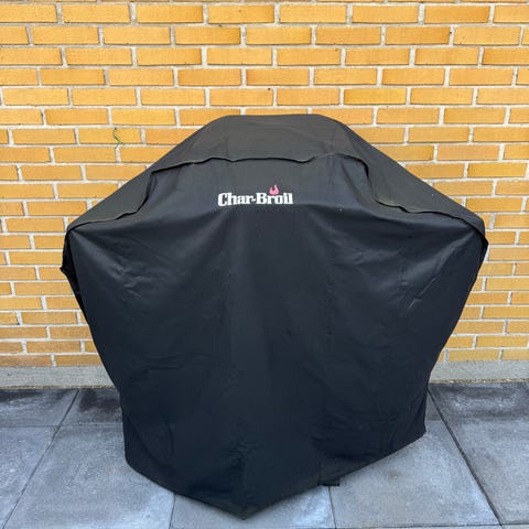 Char‑Broil gasgrill i sort med flere brændere og sidebrænder. Grillen har låg med indbygget termometer, sideborde i stål og underskab med låger til opbevaring. Grillristene er i metal og velegnede til almindelig udendørs madlavning. Der medfølger grillovertræk med Char‑Broil logo, som beskytter grillen under opbevaring udendørs.