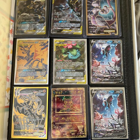 Pokémon samlemappe med blandede kort. Mappen indeholder forskellige Pokémon-kort i plastlommer, herunder flere typer kort med forskellige figurer, angreb og energityper. Kortene fremstår som en blandet samling på tværs af serier og udgaver, egnet til samlere eller som udvidelse af en eksisterende samling.