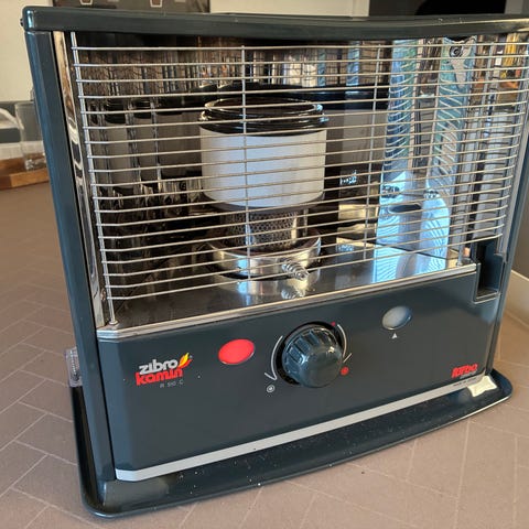 Elektrisk varmeblæser i sølvfarve. Enheden har betjeningspanel på fronten med display og knapper samt luftudgang nederst på fronten. Velegnet til opvarmning af mindre rum eller værksted. Tilsluttes almindelig stikkontakt via ledning i toppen af apparatet.