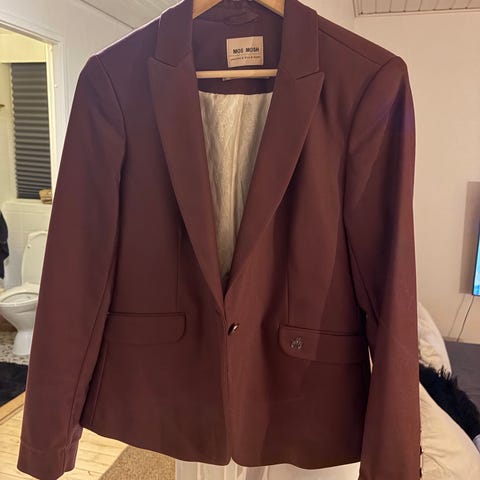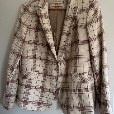 Denne blazer har to lommer foran, og den lukkes med en enkelt guld farvet knap.