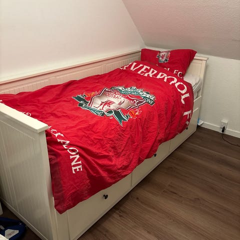 IKEA udtræksseng børneseng i hvid. Sengen har udtræksfunktion med lamelbund og tre skuffer under til opbevaring. Egnet som seng til børn eller som ekstra soveplads i børneværelse eller gæsteværelse. Madrassen på billederne viser sengens størrelse og anvendelse.