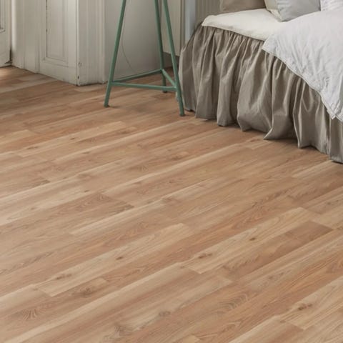 Laminatgulv i plankegulvsdesign med lys egetræ look. Gulvet består af aflange planker med tydelig træstruktur i en lys, neutral tone. Egnet til brug i boligområder som stue, soveværelse eller gang. Overfladen er glat med træmønstret dekor, som giver indtryk af lyst egetræ.