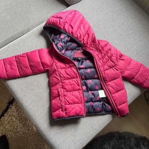 Lækker overgangsjakke til din 4-5 årige. Blød og behagelig. Lille hul foran men ingen betydning for brugen.
