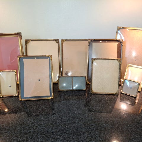 Forgyldte billedrammer af ældre dato og nogle med buet glas. Otte styk i forskellige størrelser - den største er A4 og den mindste er A6. Sælges samlet for 400 kr og individuelt for 50 kr (små) og 100 kr (store og buet glas).