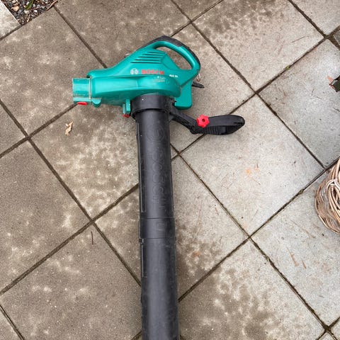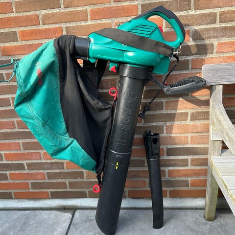 Bosch løvsuger med opsamlingspose. El-drevet haveværktøj til opsamling og bortblæsning af blade og mindre haveaffald. Inkluderer skulderrem og stofpose til opsamling, som kan afmonteres for tømning. Velegnet til brug på terrasse, indkørsel og i havegange, hvor der ønskes effektiv oprydning af blade og smågrene.