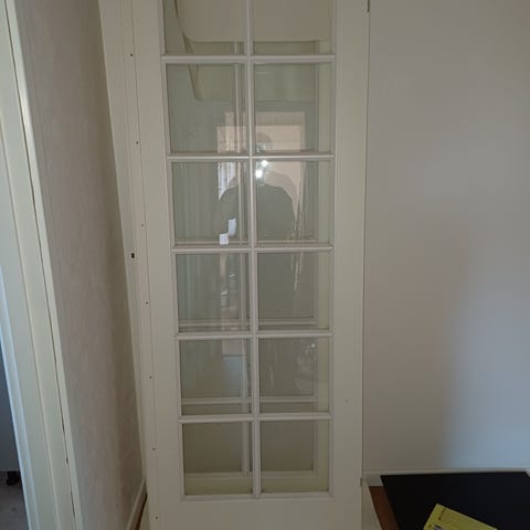 Dobbelt fransk dør i hvidmalet træ med flere glasfelter i hvert dørblad. Klassisk sprosseopdeling giver godt lysindfald. Døren er udstyret med metalgreb. Velegnet hvor der ønskes en lys og traditionel løsning med glasdøre.