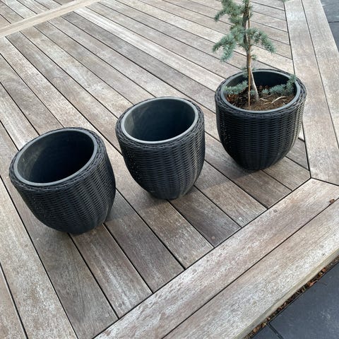 Firkantede plantekrukker i rattan i sort plast. Krukkerne har inderspand / indsats, som gør det nemmere at plante og flytte planterne. Velegnet til brug på terrasse, altan eller i have til blomster og mindre buske. Mål: 26x26 højde 50 cm PRIS PR STK 135 kr
