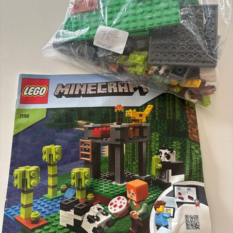 LEGO Minecraft byggesæt 21158 panda-legeområde. Sættet forestiller et Minecraft-miljø med pandaer, en figur, bambus og en lille byggeplads med platform og tilbehør. Indeholder klodser til at bygge flere mindre scener, som vist på æsken. Velegnet til børn fra 7 år og opefter ifølge æskeangivelsen.