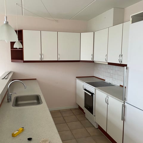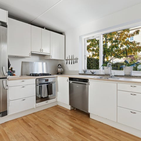 IKEA køkken med hvide låger og egetræbordplade
