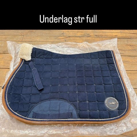 Rideunderlag i quiltet sort materiale med kontrastkant i rød, hvid og sort. Underlaget har gjordstropper og stropper til fastgørelse ved sadlen. Velegnet som almindeligt underlag under sadel til ridning.