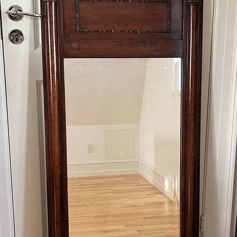 Antikt ovalt spejl med mørk mahogni træramme. Spejlet har en oval form med en bred, mørk træramme og en glat spejloverflade. På bagsiden ses en lukket bagsideplade. Velegnet som vægspejl i fx entré, soveværelse eller stue. Mål kan anslås ud fra den viste tommestok på billederne.