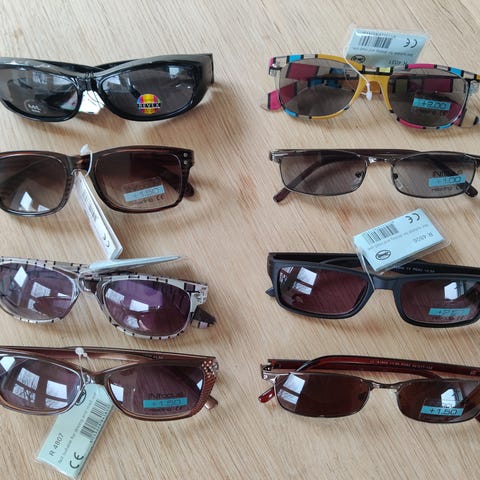 Alle solbrillerne er nye, og er pakket i folieposer klar til afhentning/forsendelse.