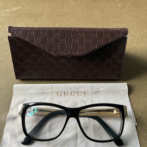 Gucci briller til kvinder med skildpaddefarvet acetatstel. Rundt/let ovalt stel med fuld ramme omkring glassene. Diskret Gucci-logo på stængerne og i det ene glas. Leveres i hårdt etui med indvendig foring og pudseklud, som vist på billederne. Velegnet som brillestel til styrkeglas eller som modebrille efter tilpasning hos optiker.